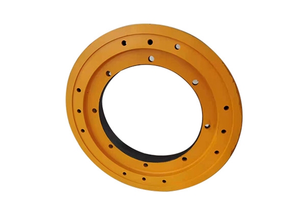 曳引轮的构造型式:整体曳引轮分成两部分构成,中间为轮筒(鼓),外面制成轮圈式绳槽切削在轮圈上,外轮圈与内轮筒套装,并用铰制螺栓连结在一起成为一个曳引轮整体。其曳引轮的轴就是减速器内的蜗轮轴。